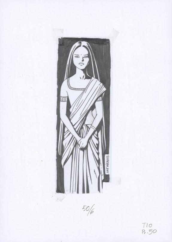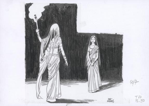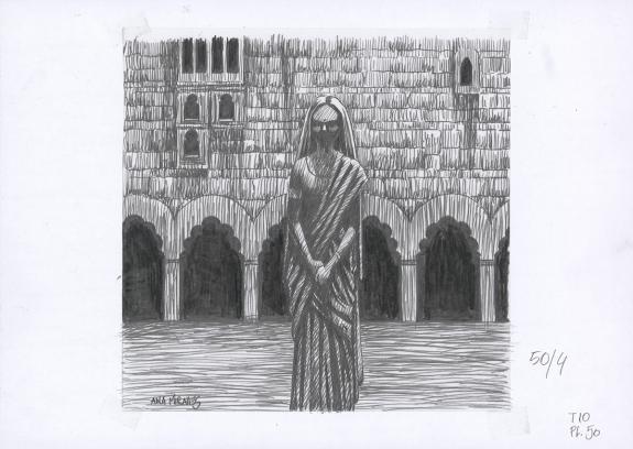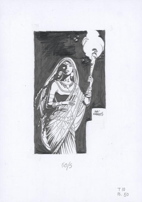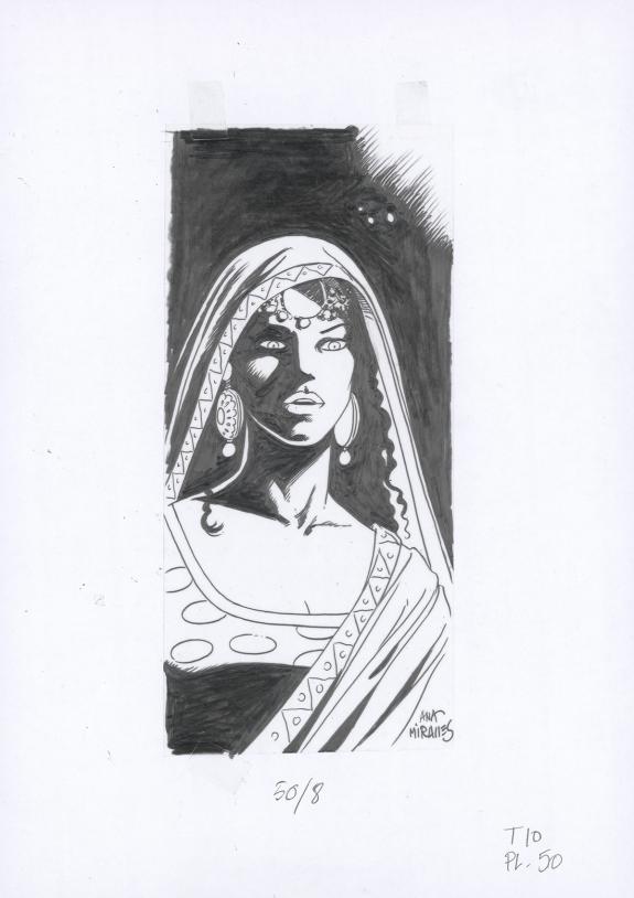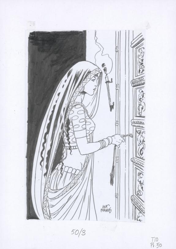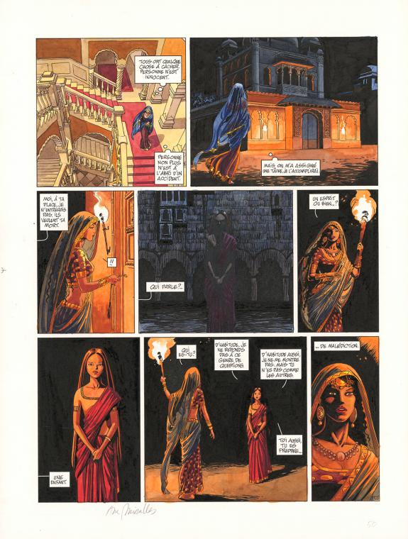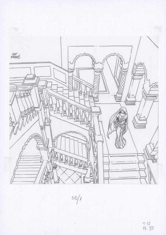 > Catalogue > Ana Miralles > Djinn > Le Pavillon des plaisirs > Planche originale n°50 accompagnée de ses 8 étapes préparatoires à la mine de plomb sur calque