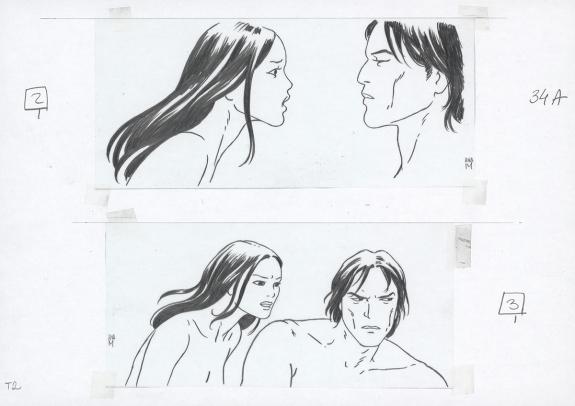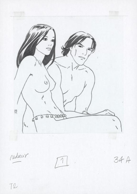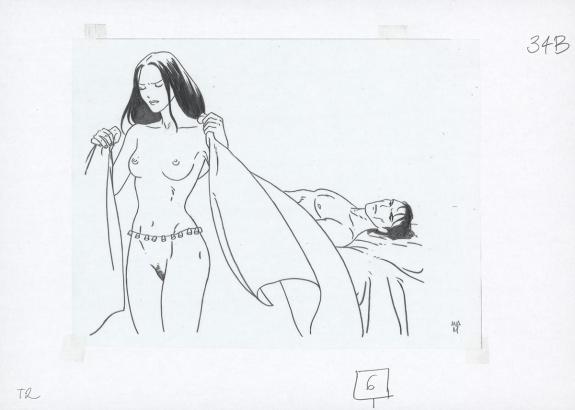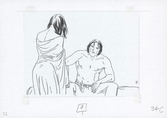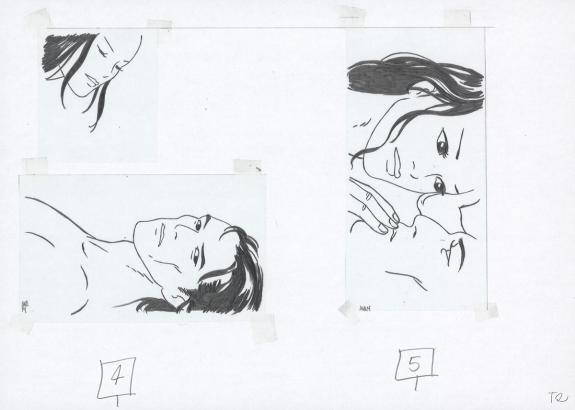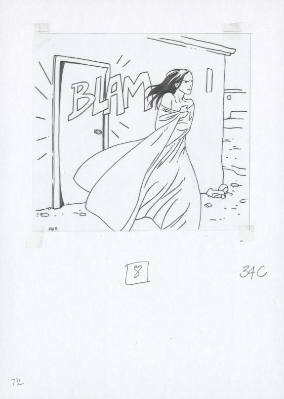 Planche originale n°34 accompagnée de ses 6 étapes préparatoires à la mine de plomb sur calque