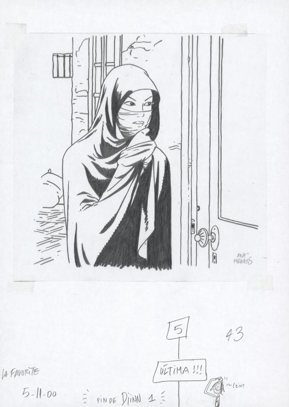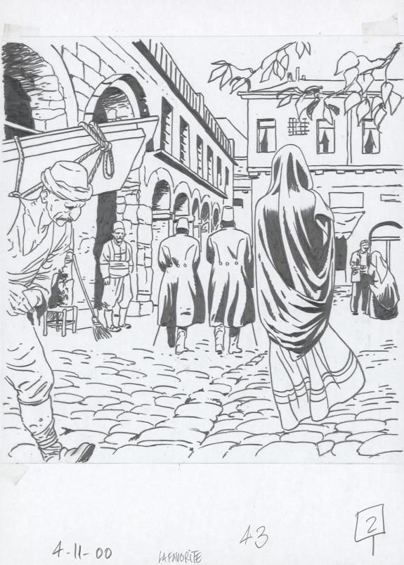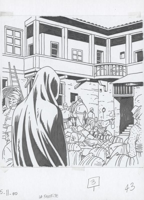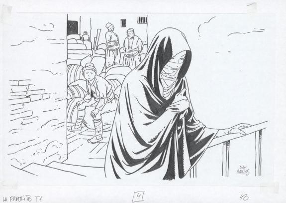 > Catalogue > Ana Miralles > Djinn > Un Honneur retrouvé > Planche originale n°43 accompagnée de ses 4 étapes préparatoires à la mine de plomb sur calque
