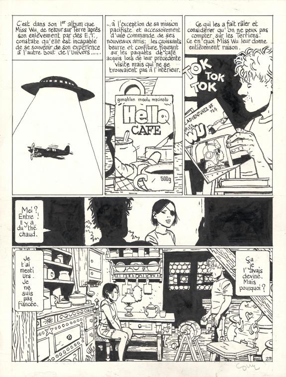 Planche originale n°29 accompagnée de sa mise en couleurs et d'un cadre de texte pour la case n°2