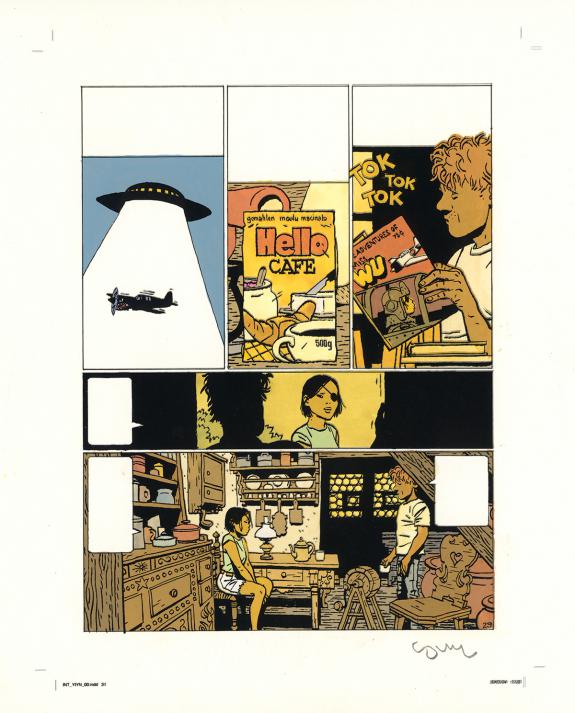 > Catalogue > Cosey > Album(s) sans série > Yiyun > Planche originale n°29 accompagnée de sa mise en couleurs et d'un cadre de texte pour la case n°2