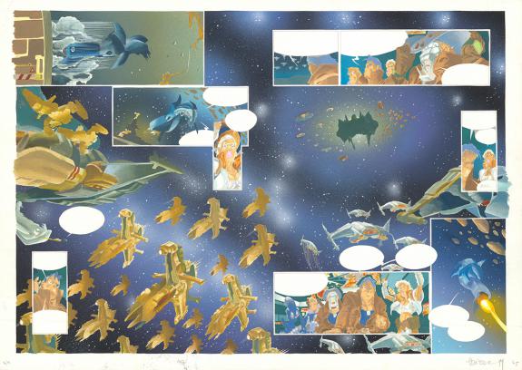 > Catalogue > Crisse > Kookaburra > Album sans titre > Double planche originale n°12-13 accompagnée de sa mise en couleurs. Présence de collages
