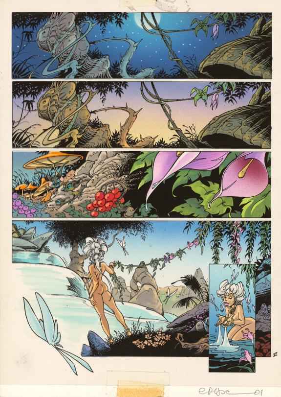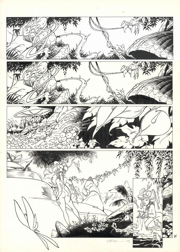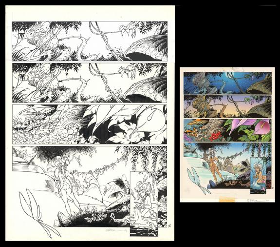 > Catalogue > Crisse > L'Épée de Cristal > L'épée de cristal - Intégrale > Planche originale n°6 accompagnée de son bleu de mise en couleurs. La première case et une impression apposée sur le support