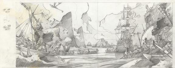 > Catalogue > Frédéric Pillot > Album(s) sans série > Album sans titre > Crayonné préparatoire original réalisé sur deux supports reliés par de l'adhésif, pliures dans l'angle inférieur gauche, tâches sur la partie gauche