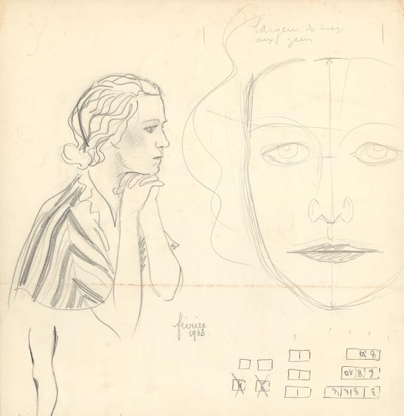 > Catalogue > Hergé > Album(s) sans série > Album sans titre > Crayonné original,Portrait de la première femme de Hergé réalisé en 1933 accompagnée d'une recherche pour Quick et Flupke au dos