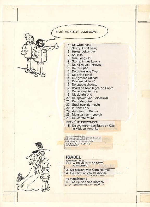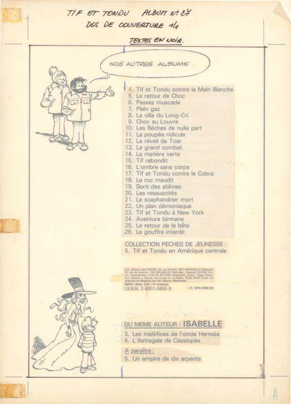 > Catalogue > Will > Tif et Tondu > Les Passes-montagnes > Illustration originale, dos de couverture de l'album. Les titres des albums sont des impressions apposée sur l'?uvre